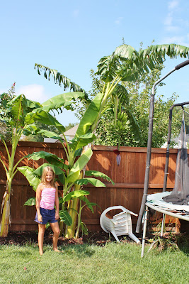 Look at the size of that banana tree! When it was planted last year in May it was as tall as my daughter. By August it was at least 14 feet tall! Give banana trees a try this year and have your kids join in the fun of marking the plants progress. Your yard will feel tropical and you will have free bananas! How fun is that?!