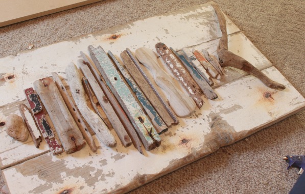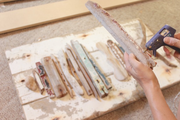 Once you have your backdrop, plug-in your hot glue gun and lay out your pieces of driftwood in the shape you desire.
